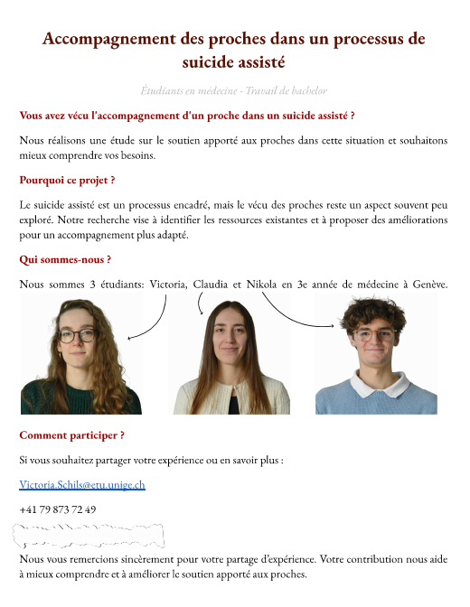 Dans le cadre de leur travail de bachelor qui porte sur l’accompagnement des proches dans un contexte de suicide assisté, Victoria, Claudia et Nikola, trois jeunes étudiants en médecine ont élaboré, afin de compléter leur analyse, un questionnaire anonyme destiné aux proches ayant accompagné une personne dans une démarche de suicide assisté.
